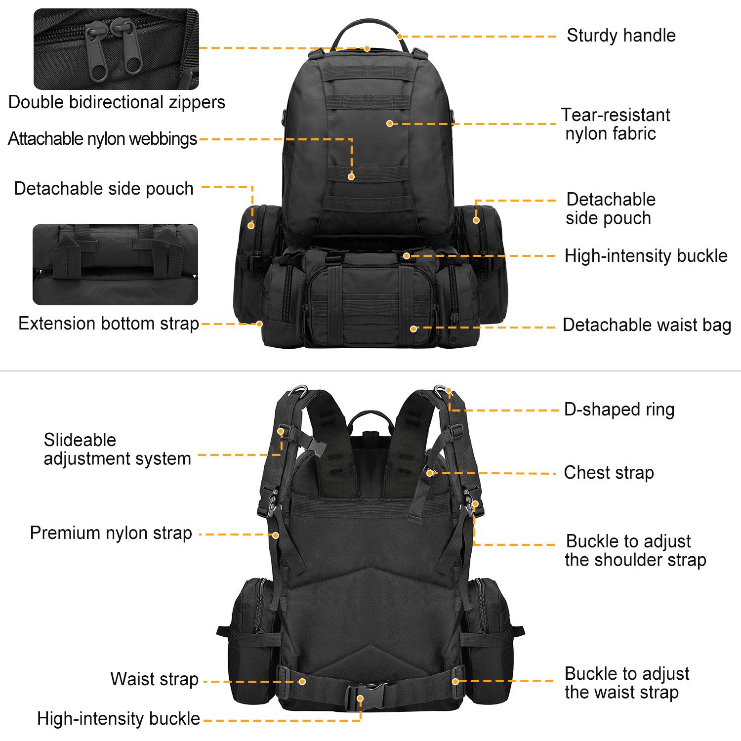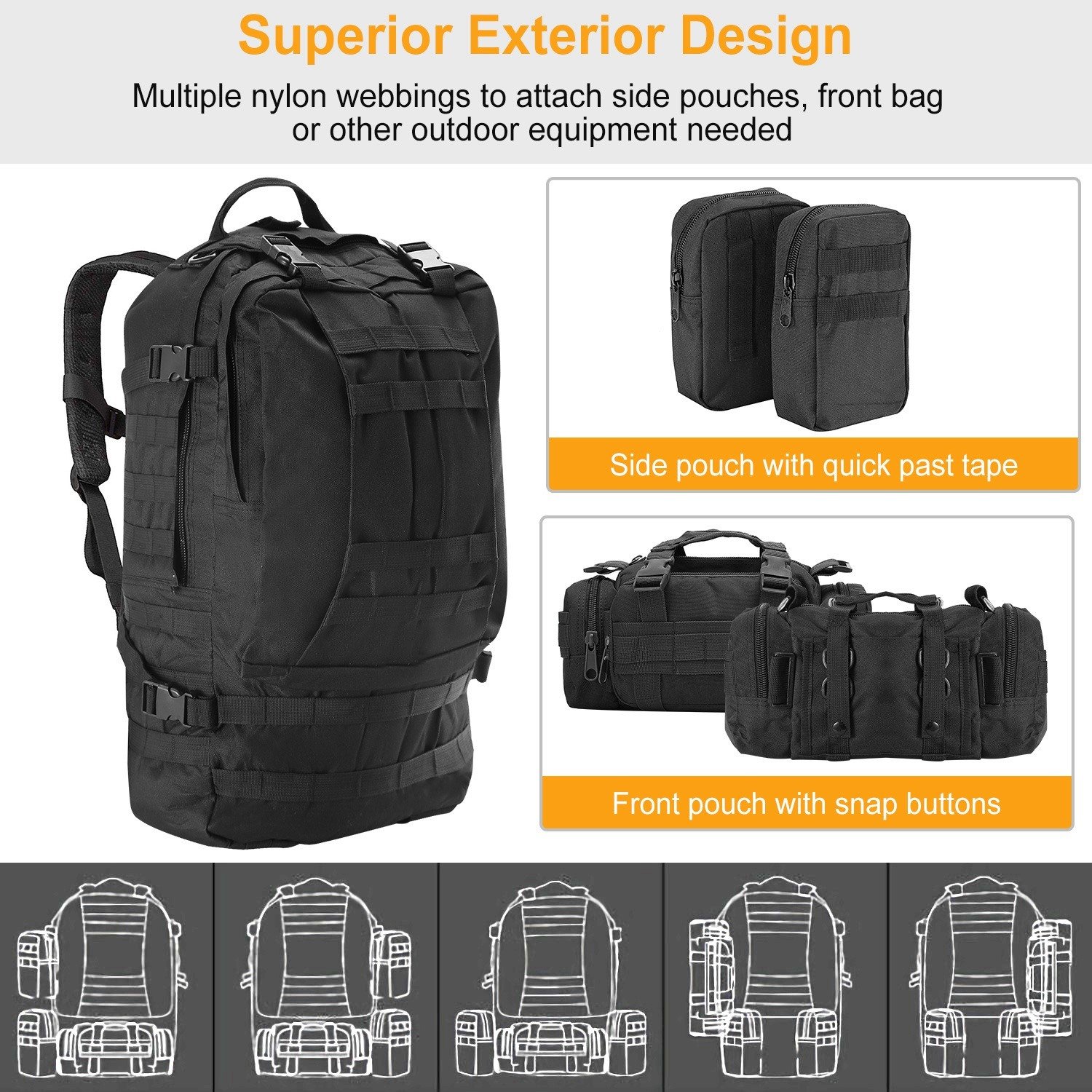 **WIDE APPLICATION*:Can be widely used for most outdoor activities as military backpack,3 day assault pack,combat backpack,range bag,hunting backpack,survival backpack,comping backpack,trekking backpack,traveling backpack,etc.