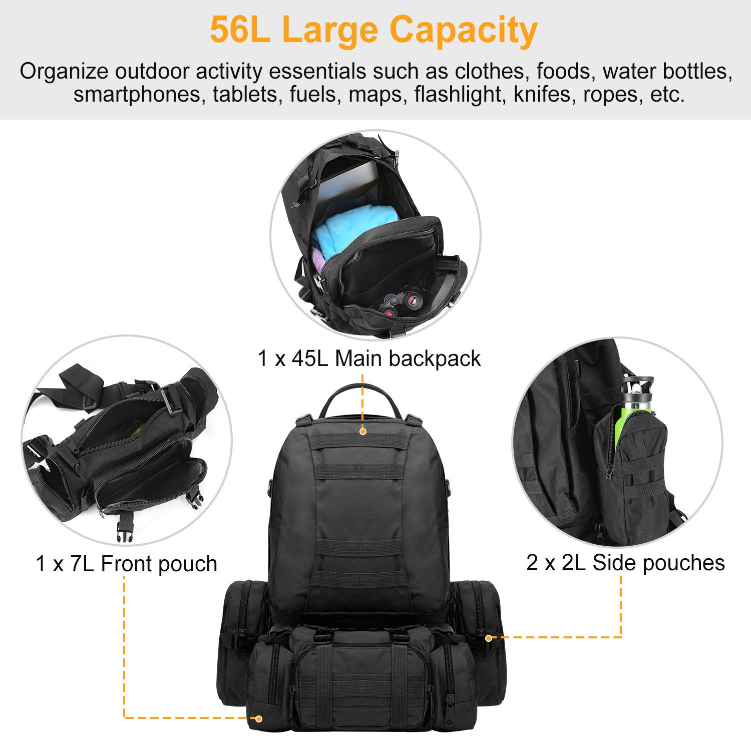 **56L LARGE CAPACITY*:With the combination of 2pcs 2L side pouches and 1pcs 7L front pouch,our backpack(45L in itself) can provide total 56L large capacity to organize outdoor activity essentials such as clothes,foods,water bottles,smartphones,tablets,fuels,maps,flashlight,knifes,ropes,etc.
