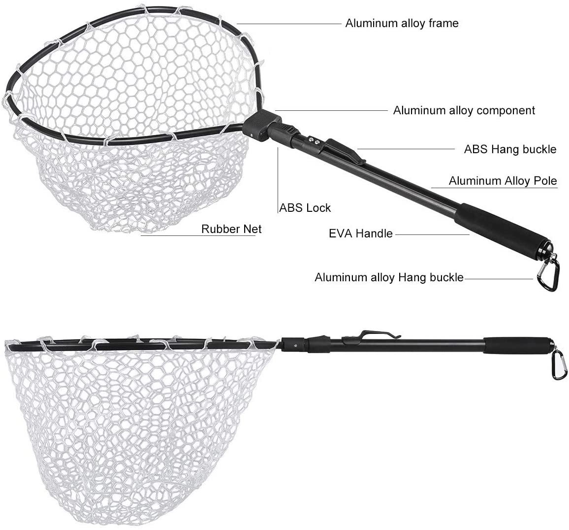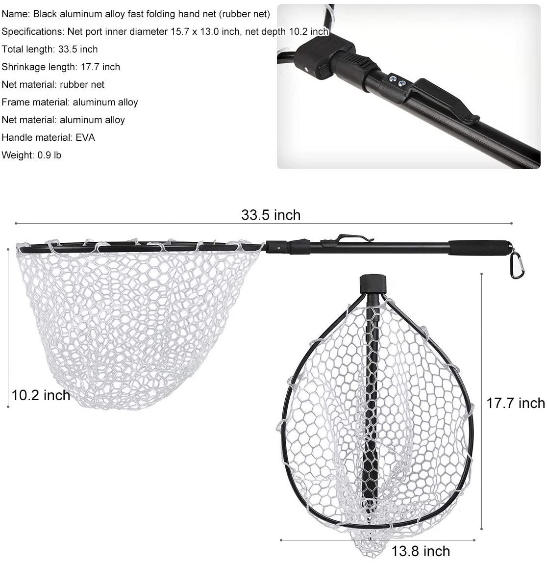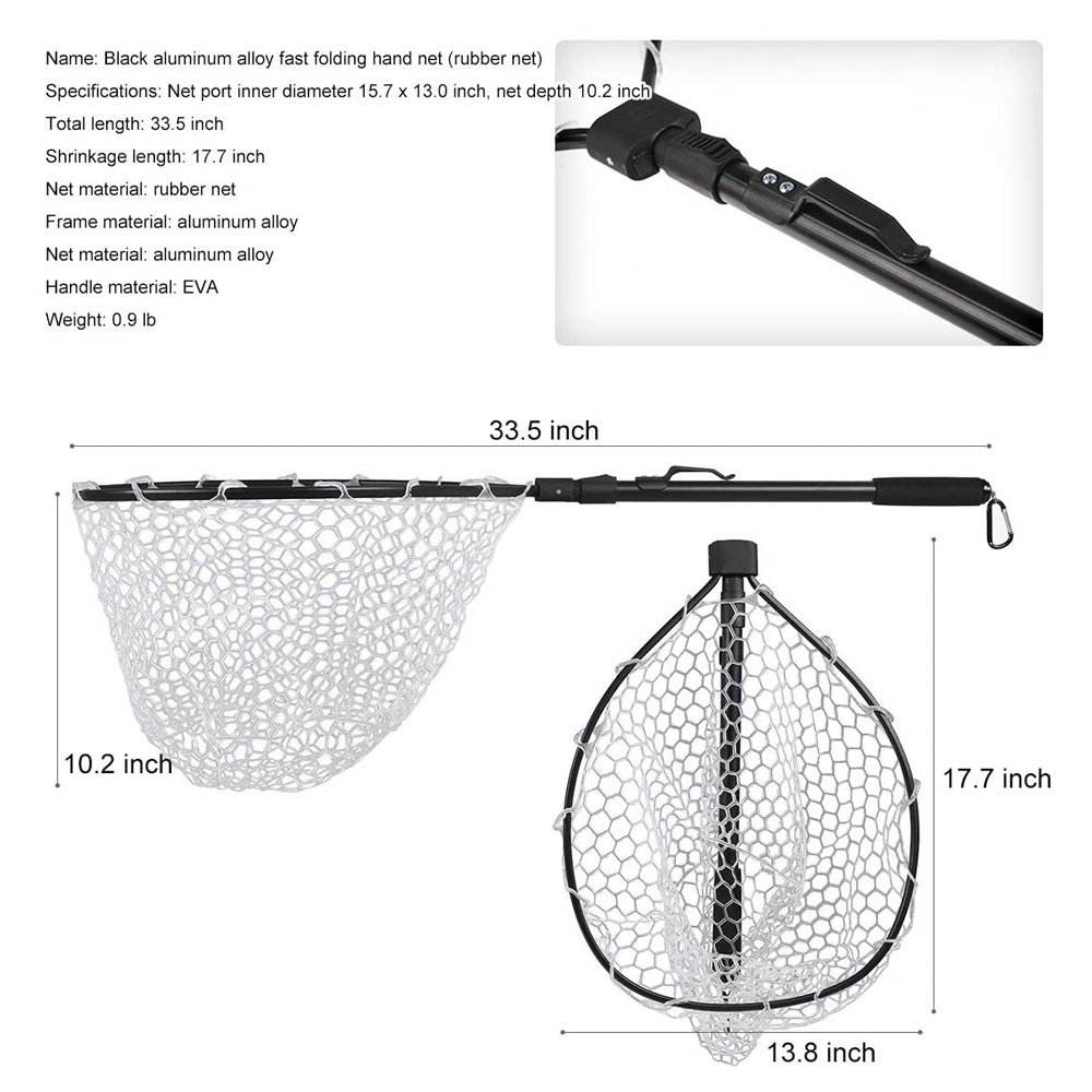 3.Hoop size: 15.7" x 13", Extend Length: 33.5", Collapsed Length: 17.7", Net Depth: 10.2", Weight: 0.9 lb.