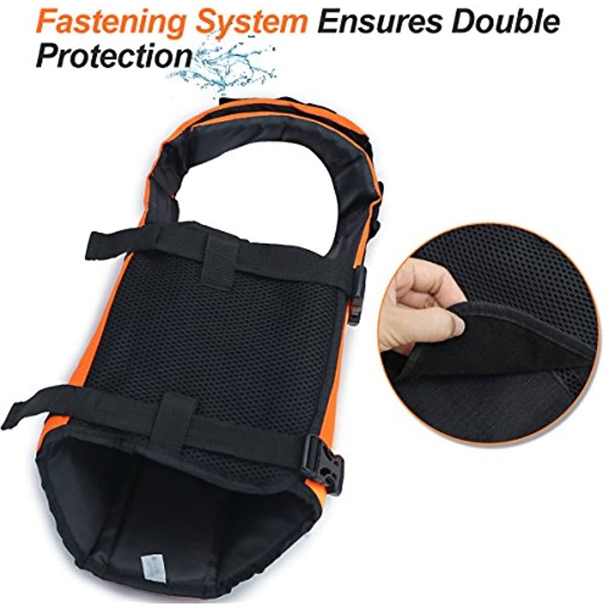 FOR DOG'S SAFETY: dog PFD is constructed with extra padding to enable strong buoyance in the water without restricting your dog's movement. Fastening system around belly and neck will keep the flotation vest securely on your dog