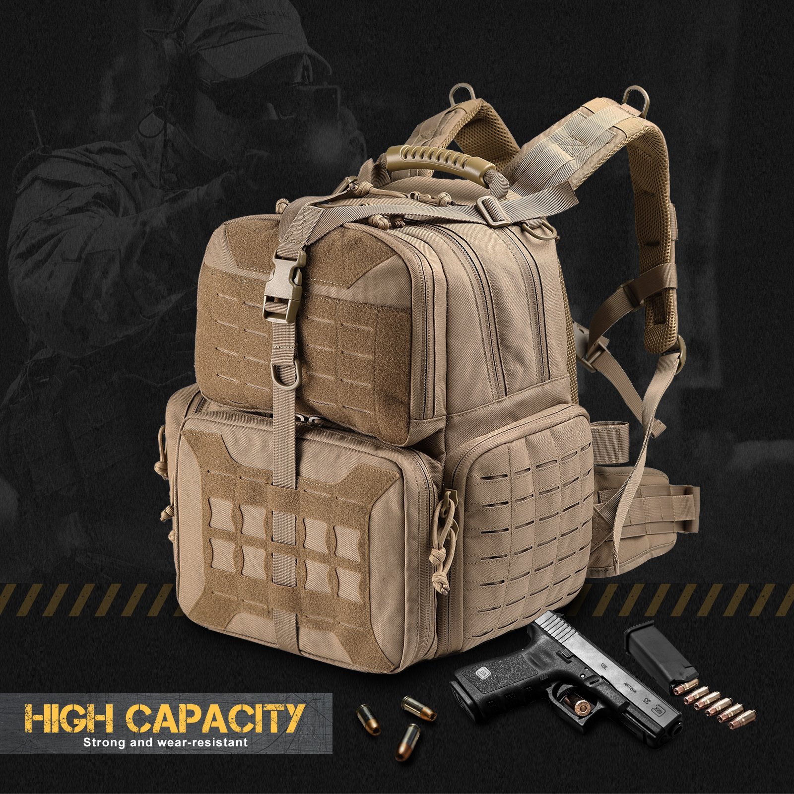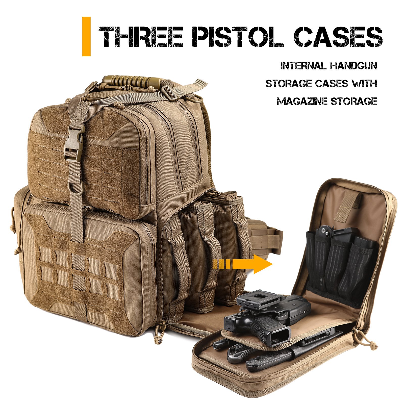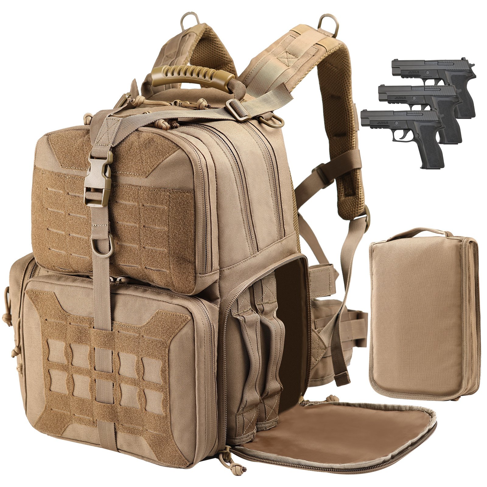 Multifunctional Professional Range Bag: VOTAGOO range backpack can hold 3 pistols of different size and magazines. Large capacity space can be used to carry all tactical accessories you need such as sabers; flashlights; shooting goggles; shooting earmuff; gloves; etc.Durable Design With 1000D Nylon: This Tactical range bag is made of 1000D polyester fabric; sturdy; water-resistant; durable; suitable for tactical range activity and outdoor shooting or hunting. Three removable pistol cases built-in sponges can protect guns and ammo more effective; avoid wear and tear.Comfortable & Portable: Professional breathable & ergonomic thicker padded design on the back make you sweat-proof and comfortable. Lockable compartment make your firearms more safe and avoid unnecessary troubles. Thoroughly design will fulfill your range day needs.Stylish & Upgrade Dimension: The Size of this range backpack is L14' x W10' x H17'. Built-in backpack rain cover can handle any weather without worrying about your backpack getting dirty. Customizable web can make your backpack more personalized.VOTAGOO After-sale Service: VOTAGOO has been committed to the R&D and production of tactical equipment. We offer 180-day warranty. Please contact us feel free; we are always here to help.
